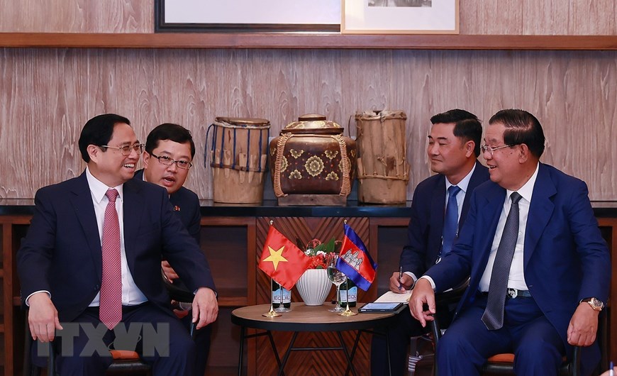 นายกรัฐมนตรีฝ่ามมิงชิ้งพบปะกับสมเด็จ ฮุนเซน นายกรัฐมนตรีกัมพูชา (VNA) |