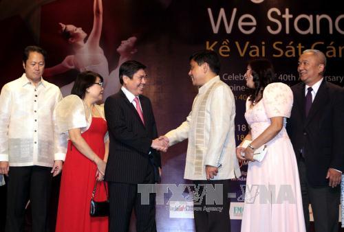 (VOVworld) – พิธีฉลองครบรอบ 40 ปีการสถาปนาความสัมพันธ์ทางการทูตระหว่างเวียดนามกับฟิลิปปินส์และ 118 ปีวันชาติฟิลิปปินส์ได้มีขึ้นเมื่อค่ำวันที่ 14 มิถุนายน ณ นครโฮจิมินห์ นาง เลถิฝุ่ง กงสุลใหญ่กิตติมศักดิ์ฟิลิปปินส์ในนครโฮจิมินห์ได้ย้ำว่า ในตลอด 40 ปีที่ผ่านมา ทั้งสองประเทศได้บรรลุผลงานสำคัญในการพัฒนาเศรษฐกิจ วัฒนธรรมและสังคม ซึ่งความสัมพันธ์นี้ได้รับการพัฒนามากขึ้นผ่านโครงการร่วมมือในหลายด้าน โดยเฉพาะอุตสาหกรรมอาหาร เภสัชกรรม วัฒนธรรมและการศึกษา จนถึงขณะนี้ ฟิลิปปินส์มีกว่า 60 โครงการที่กำลังลงทุนในเวียดนาม รวมทั้งมี 30 โครงการในนครโฮจิมินห์ ในโอกาสนี้ นาย เหงียนแถ่งฟอง ประธานคณะกรรมการประชาชนนครโฮจิมินห์ได้กล่าวอวยพรประชาชนฟิลิปปินส์ และย้ำว่า นครโฮจิมินห์เป็นท้องถิ่นนำหน้าของประเทศในการปฏิบัติโครงการร่วมมือในทุกด้านกับฟิลิปปินส์ แสดงความเชื่อมั่นว่า ด้วยความมุ่งมั่นทำนุบำรุงความสัมพันธ์ทวิภาคีของผู้นำและประชาชนทั้งสองประเทศ ความสัมพันธ์เวียดนาม-ฟิลิปปินส์จะบรรลุก้าวเดินใหม่ในทุกด้าน นำผลประโยชน์ที่จริงจังมาสู่ทั้งสองประเทศ.