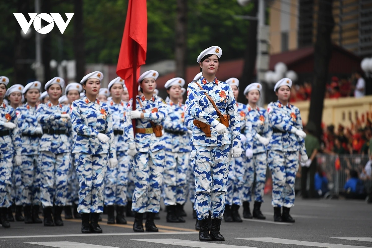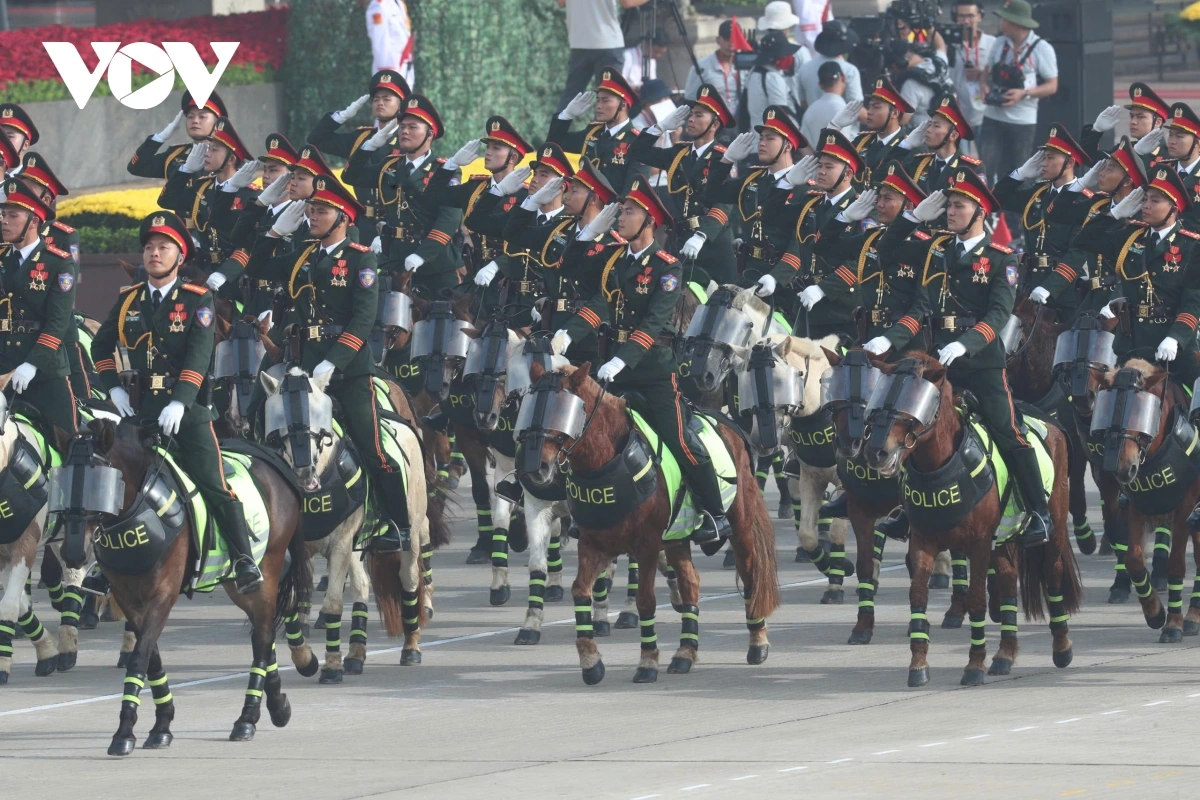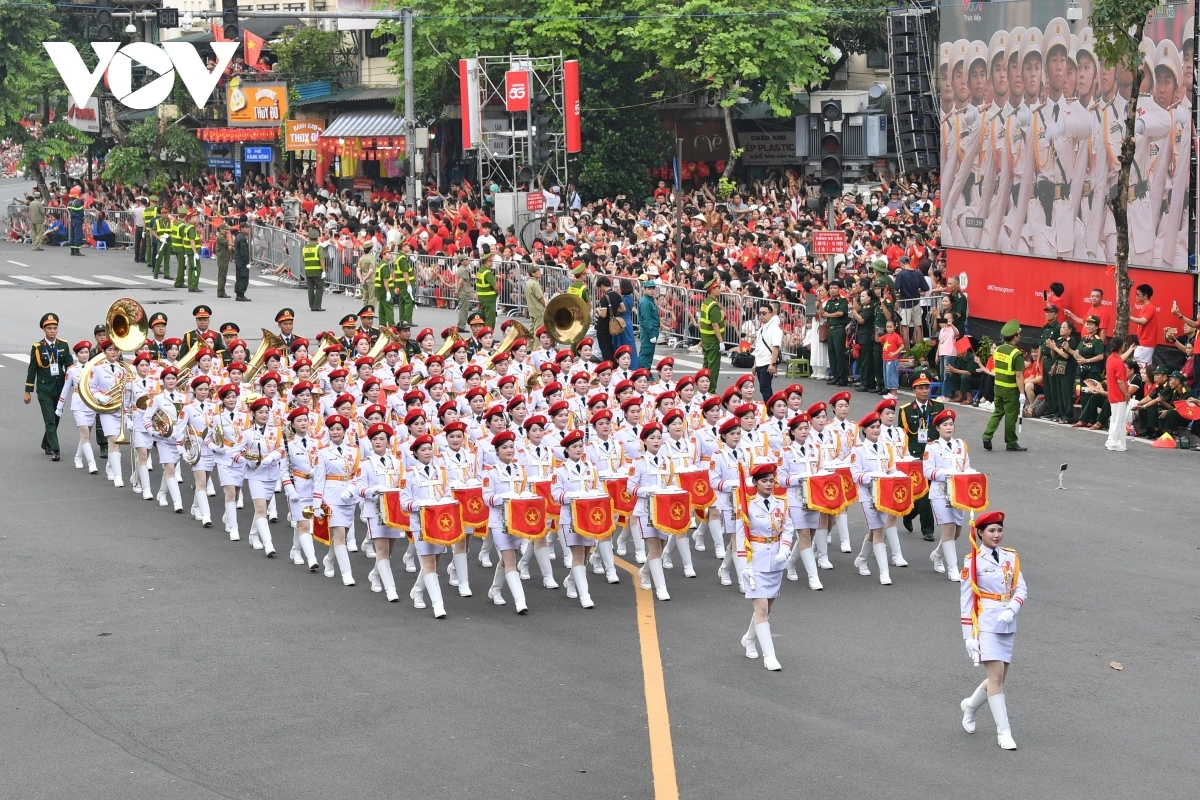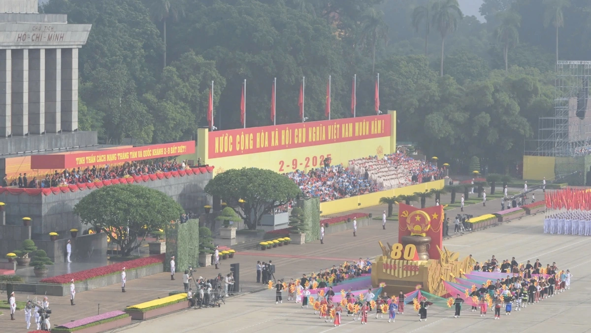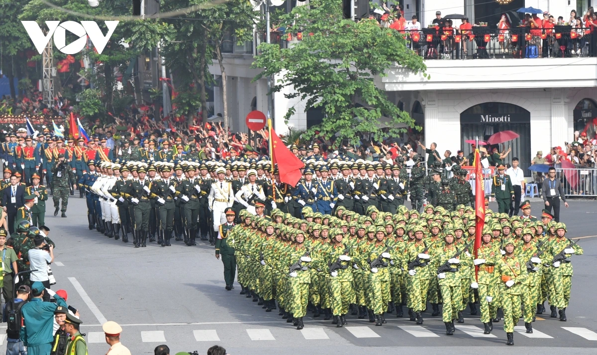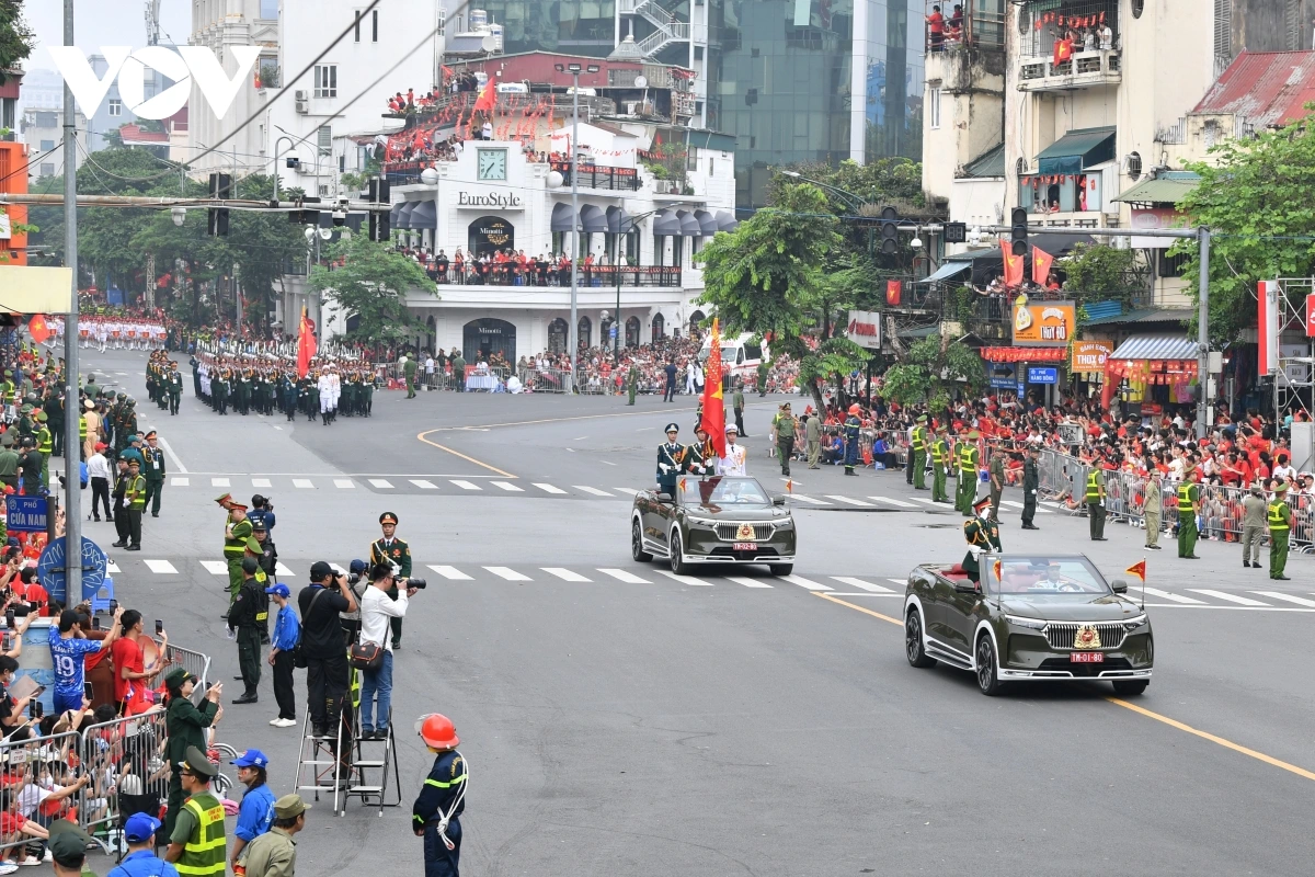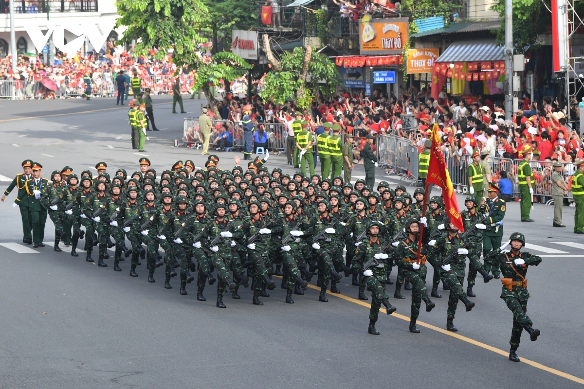 หลังการกล่าวสุนทรพจน์ของเลขาธิการใหญ่พรรคก็เป็นการเริ่มพิธีเดินสวนสนามและขบวนพาเหรด โดยมีผู้เข้าร่วมประมาณ 16,000 คน รวมขบวนพาเหรด 79 ขบวน กองทัพอากาศประชาชนเวียดนามได้เป็นกองกำลังเปิดพิธีสวนสนาม ต่อมาเป็นขบวนพาเหรดของกองกำลังเกียรติยศ กองทัพประชาชนเวียดนาม กองทัพต่างประเทศ กองกำลังอาสาสมัคร กองกำลังจรยุทธ์ และตำรวจ ขบวนพาเหรดของยานพาหนะทางทหาร ปืนใหญ่ รถตำรวจพิเศษ และขบวนขององค์กรมวลชน