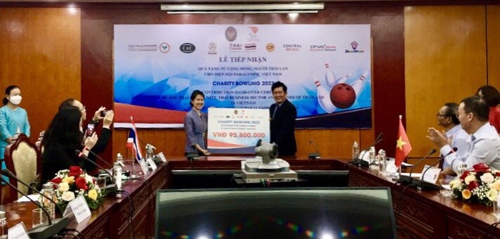 นางสาว มรกต เจนมธุกร อัครราชทูต เป็นตัวแทนสถานเอกอัครราชทูต ณ กรุงฮานอย มอบเงินบริจาคจากกิจกรรมโบว์ลิ่งการกุศล ค.ศ. 2022 มูลค่า 95,800,000 ด่งให้แก่นาย หวิ่งหวิงอ๋าย ประธานสมาคมพาราลิมปิกเวียดนาม |