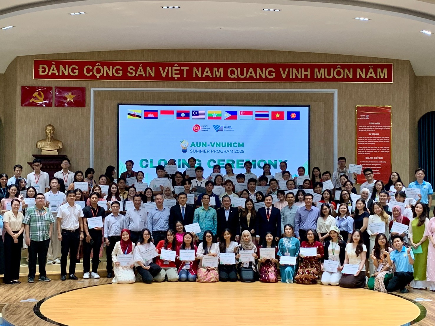 เมื่อวันที่ 18 กรกฎาคม ได้มีการจัดพิธีปิดโครงการ “AUN-VNUHCM Summer Program 2025” ณ มหาวิทยาลัยเทคโนโลยีสารสนเทศ มหาวิทยาลัยแห่งชาติเวียดนามนครโฮจิมินห์ (Vietnam National University, Ho Chi Minh City: VNUHCM) ซึ่งจัดขึ้นโดย VNUHCM ร่วมกับเครือข่ายมหาวิทยาลัยอาเซียน (ASEAN University Network: AUN) โดยมีการเข้าร่วมของกงสุลใหญ่ไทย มาเลเซียและสิงคโปร์ ณ นครโฮจิมินห์ ในโอกาสนี้ รองศาสตราจารย์ ดร. Nguyen Minh Tam รองอธิการบดี VNUHCM ได้กล่าวว่า โครงการฯที่ถูกจัดจัดขึ้นระหว่างวันที่ 7-19 กรกฎาคม โดยมีนักศึกษา 73 คนจาก 22 มหาวิทยาลัยใน 8 ประเทศสมาชิกอาเซียนเข้าร่วม พร้อมด้วยคณาจารย์และผู้เชี่ยวชาญ 22 คน ในกรอบของโครงการ มีกิจกรรมหลากหลายทั้งการบรรยาย การแลกเปลี่ยนวัฒนธรรม กิจกรรมกีฬา และการศึกษาดูงานภาคสนามที่ป่าชายเลน Can Gio (นครโฮจิมินห์) และจังหวัดอานซาง
