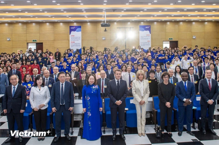 ประธานาธิบดี เอ็มมานูเอล มาครงกับรองประธานประเทศ หวอถิแอ๊งซวนถ่ายภาพกับบรรดาผู้แทนและนักศึกษาที่มหาวิทยาลัยวิทยาศาสตร์และเทคโนโลยีฮานอย หรือ USTH (VNA) |