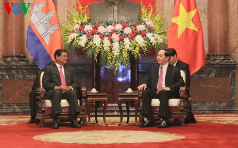 ![]() ประธานประเทศเจิ่นด่ายกวางให้การต้อนรับรองนายกรัฐมนตรีกัมพูชา