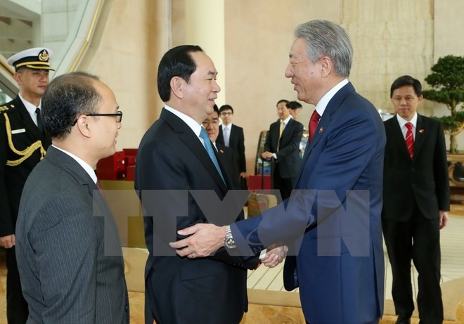ในเช้าวันเดียวกัน ในการกล่าวปราศรัยในการพบปะกับรัฐมนตรีกิตติมศักดิ์อาวุโสของสิงคโปร์ โก๊ะจ๊กตง นาย เจิ่นด่ายกวาง ได้กล่าวขอบคุณความพยายามของนาย โก๊ะจ๊กตง ในการผลักดันความสัมพันธ์ระหว่างเวียดนามกับสิงคโปร์ และย้ำว่าความสัมพันธ์ระหว่างสองประเทศได้มีการพัฒนาอย่างรวดเร็วผ่านการเยือนและการพบปะสังสรรค์ระดับสูง โดยสิงคโปร์ได้กลายเป็นหุ้นส่วนการค้าและการลงทุนอันดับต้นๆ ของเวียดนาม นาย โก๊ะจ๊กตง เป็นผู้วางรากฐานให้แก่การยกระดับความสัมพันธ์เป็นหุ้นส่วนยุทธศาสตร์เมื่อปี 2013 อีกทั้งแสดงความเชื่อมั่นว่า ความสัมพันธ์ทวิภาคีระหว่างเวียดนามกับสิงคโปร์จะได้รับการเสริมสร้างให้ใกล้ชิดและมีประสิทธิภาพมากขึ้นบนพื้นฐานของความไว้วางใจ ส่วนในการพบปะระหว่างประธานประเทศเวียดนาม เจิ่นด่ายกวาง กับนาย เตียว ชี เฮียน รองนายกรัฐมนตรีสิงคโปร์ที่ดูแลด้านการประสานงานเกี่ยวกับปัญหาความมั่นคง ทั้งสองฝ่ายได้แสดงความยินดีต่อการพัฒนาอย่างเข้มแข็งของความร่วมมือด้านกลาโหมและความมั่นคงระหว่างสองประเทศในช่วงเวลาที่ผ่านมา โอกาสนี้ ประธานประเทศ เจิ่นด่ายกวางและภริยาได้ไปเยือนเขตเทคโนโลยีเพื่อการสร้างสรรค์ One North.
