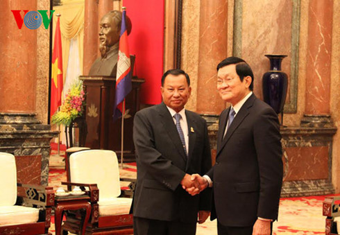 ![]() ประธานประเทศ เจืองเติ๊นซาง ให้การต้อนรับสมเด็จ ไซชุม ประธานวุฒิสภากัมพูชา