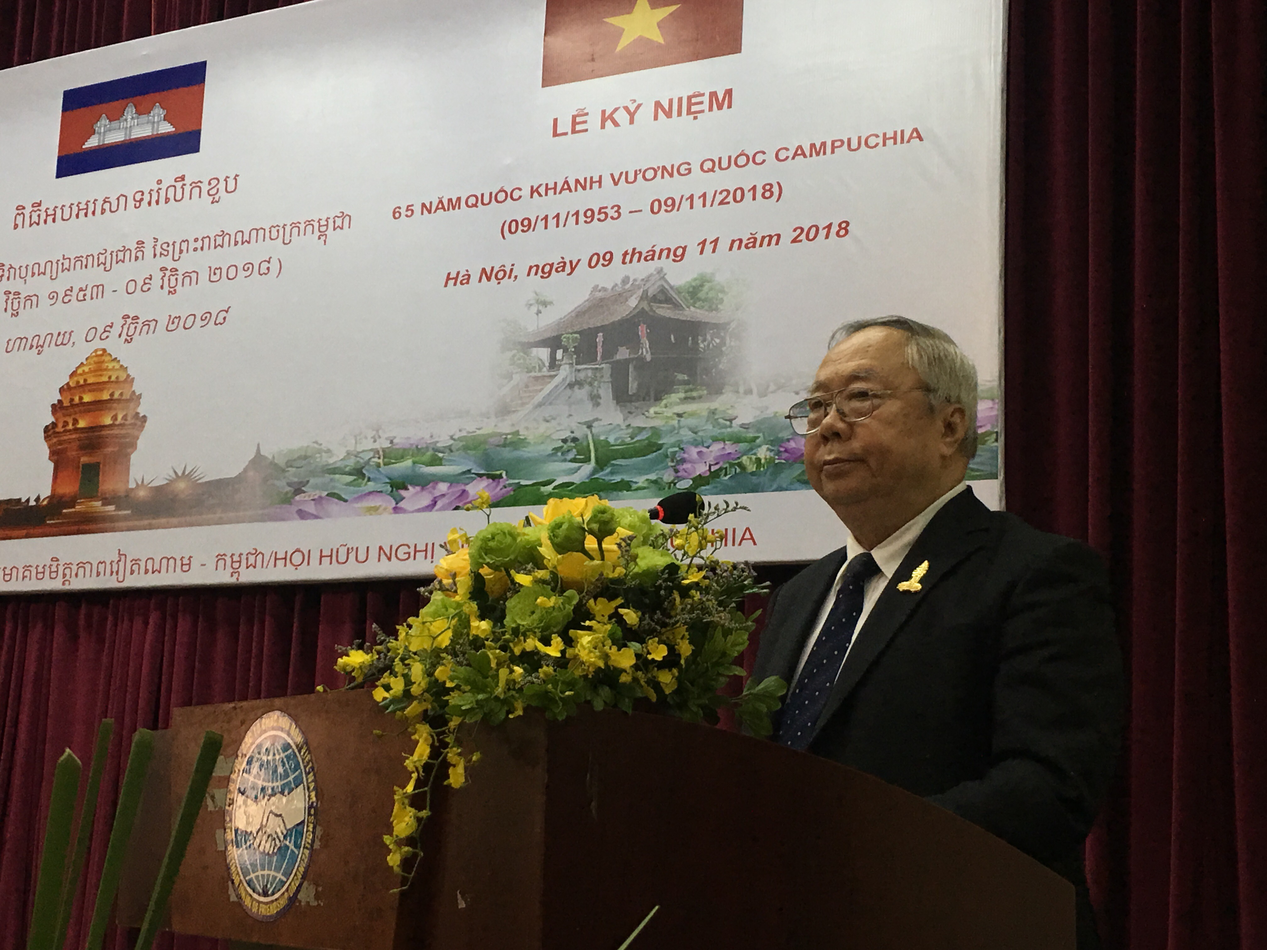 ในการกล่าวปราศรัยในพิธี นาย หวูหมาว นายกสมาคมมิตรภาพเวียดนาม – กัมพูชาได้ชื่นชมผลสำเร็จที่ประชาชนกัมพูชาได้บรรลุในตลอด 65 ปีที่ผ่านมาและขอให้กัมพูชาประสบความสำเร็จที่ยิ่งใหญ่ต่อไป แม้ได้ผ่านช่วงเวลาที่ลำบากต่างๆในประวัติศาสตร์ แต่ความสัมพันธ์ระหว่างเวียดนามกับกัมพูชาได้พัฒนาอย่างไม่หยุดยั้ง โดยได้เคียงบ่าเคียงไหล่ต่อต้านระบอบฆ่าล้างเผ่าพันธุ์และช่วยเหลือจุนเจือกันในการฟื้นฟูประเทศกัมพูชา ประชาชนทั้งสองประเทศได้สนับสนุนกัน ซึ่งถือเป็นสมบัติอันล้ำค่าของสองประชาติที่คนรุ่นใหม่ในปัจจุบันและรุ่นต่อๆไปควรธำรงรักษาให้คงอยู่ตลอดไป