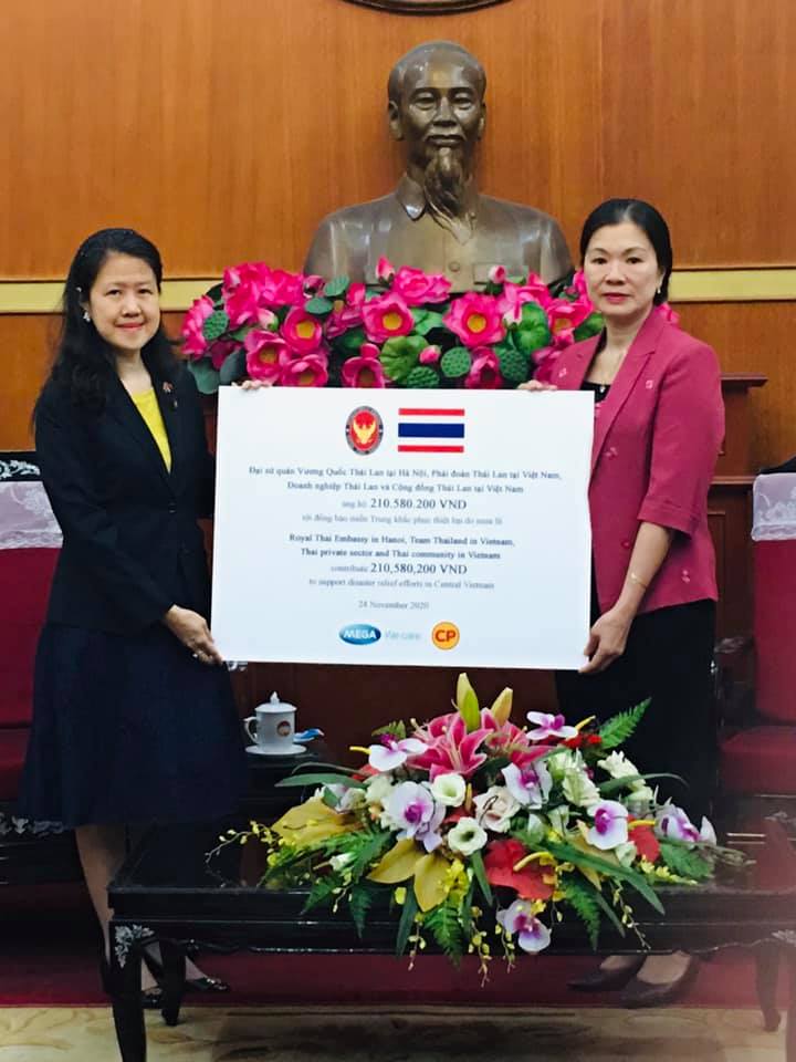 เมื่อวันที่ ๒๔ พ.ย. ๖๓ นางสาวมรกต เจนมธุกร อุปทูต สถานเอกอัครราชทูต ณ กรุงฮานอย ข้าราชการทีมประเทศไทย และผู้แทนภาคเอกชนไทย จากบริษัท CP Vietnam บริษัท Mega LifeSciences Vietnam บริษัท Prime Group และธนาคารกสิกร กรุงฮานอย ได้เข้ามอบเงินจำนวน ๒๑๐,๕๘๐,๒๐๐ ดอง หรือประมาณ ๒๗๕,๐๐๐ บาท ให้แก่นางเจือง ถิ หง็อก แอ๊ง รองประธานคณะกรรมการแนวร่วมปิตุภูมิเวียดนามส่วนกลาง เพื่อร่วมเป็นส่วนหนึ่งของการให้ความช่วยเหลือผู้ประสบอุทกภัยและดินถล่มในพื้นที่ภาคกลางของเวียดนาม