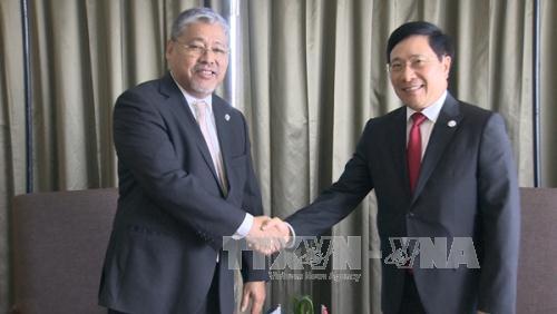 (VOVworld) – เช้าวันที่ 28 เมษายน รองนายกรัฐมนตรีและรัฐมนตรีว่าการกระทรวงการต่างประเทศเวียดนามได้มีการพบปะทวิภาคีกับรักษาการรัฐมนตรีต่างประเทศฟิลิปปินส์ รัฐมนตรีต่างประเทศมาเลเซียและรัฐมนตรีต่างประเทศอินโดนีเซียเนื่องในโอกาสเข้าร่วมการประชุมสุดยอดอาเซียนครั้งที่ 30 ณ ประเทศฟิลิปปินส์ในระหว่างวันที่ 28-29 เมษายน โดยในการพบปะกับรักษาการรัฐมนตรีต่างประเทศฟีลิปปินส์ ทั้งสองฝ่ายได้ชื่นชมความสัมพันธ์ที่มีมาช้านานระหว่างเวียดนามกับฟิลิปปินส์และเห็นพ้องกันว่า จะผลักดันการเยือนระดับสูงและการประชุมคณะกรรมการร่วมมือทวิภาคีระดับรัฐมนตรีต่างประเทศในปี 2017 ขยายความร่วมมือในปัญหาทางทะเลและการต่อต้านโจรสลัด