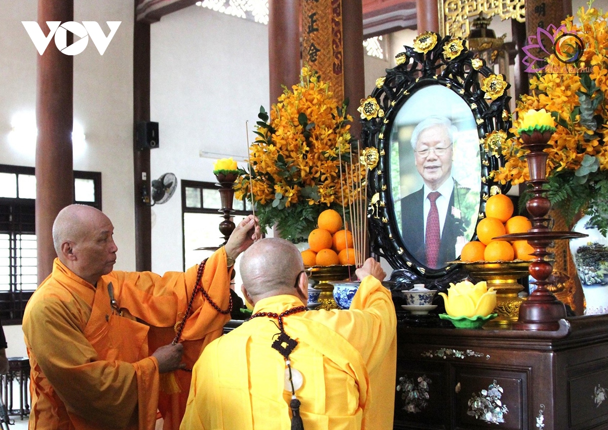 “พิธีไว้อาลัยท่านเลขาธิการใหญ่พรรค เหงวียนฟู้จ่อง และพิธีรำลึกถึงวีรชนทหารพลีชีพเพื่อชาติของพุทธสมาคมเวียดนามสาขาจังหวัดกว๋างนิง ณ วัดนิกายจุ๊กเลิมเอียนตื่อจัดขึ้นตามความปรารถนาของประชาชน โดยภาพของท่านเลขาธิการใหญ่พรรค เหงวียนฟู้จ่องจะอยู่ในใจของประชาชนเวียดนามตลอดกาล”