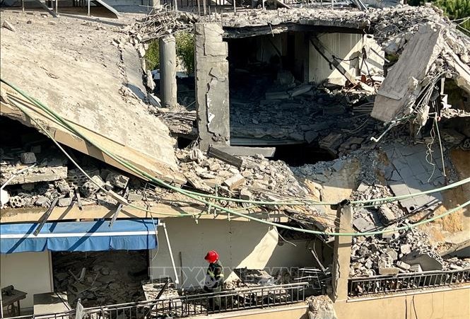 อาคารถูกทำลายหลังการโจมตีทางอากาศของอิสราเอลใส่เขตWardaniyeh ประเทศเลบานอนเมื่อวันที่ 9 ตุลาคม (Photo:THX/TTXVN) |