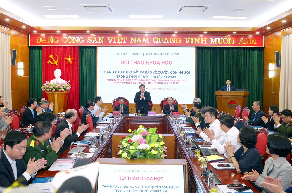 ในการนี้ ศาสตราจารย์ ดอกเตอร์ เลวันเหลย จากสถาบันรัฐศาสตร์แห่งชาติโฮจิมินห์ได้ย้ำถึงจุดยืนที่เสมอต้นเสมอปลายของพรรคคอมมิวนิสต์เวียดนามเกี่ยวกับสิทธิมนุษยชนและสิทธิพลเมือง ซึ่งได้รับการรับรอง สานต่อและพัฒนาในเอกสารการประชุมสมัชชาใหญ่พรรคฯ คือ รัฐเวียดนามให้ความเคารพ ค้ำประกันและปกป้องสิทธิมนุษยชนและสิทธิพลเมือง เวียดนามพยายามปฏิบัติคำมั่นและความร่วมมือระหว่างประเทศ ปรับปรุงกฎหมายและกลไกให้มีความสมบูรณ์เพื่อค้ำประกันสิทธิมนุษยชนและสิทธิพลเมือง ซึ่งเนื้อหาของอนุสัญญาต่างๆ ถูกระบุในรัฐธรรมนูญและกฎหมายเวียดนาม ในการนี้ บรรดาผู้แทนได้ชี้ชัดถึงความหมายและคุณค่าของปฏิญญาสากลว่าด้วยสิทธิมนุษยชนและความหมายต่อเวียดนาม โดยเฉพาะการปฏิบัติเป้าหมายการพัฒนาที่ครอบคลุมและยั่งยืน เพื่อมนุษย์และถือมนุษย์เป็นศูนย์กลาง เข้าร่วม ได้รับประโยชน์ ความได้เปรียบ ความท้าทายในการค้ำประกันและส่งเสริมสิทธิมนุษยชนในเวียดนามและโลกในสภาวการณ์ที่สถานการณ์มีการเปลี่ยนแปลง เสนอแนวทางและมาตรการปรับปรุงระบบนโยบาย กฎหมายให้สมบูรณ์ สอดคล้องกับมาตรฐานของโลกเกี่ยวกับสิทธิมนุษยชน.