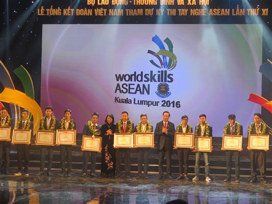 ในการนี้ นาง ดั่งถิหงอกถิ่ง รองประธานประเทศและนาย ด่าวหงอกยุง รัฐมนตรีว่าการกระทรวงแรงงาน ทหารทุพลภาพและสังคมได้มอบหนังสือชมเชยของนายกรัฐมนตรี กระทรวงแรงงาน ทหารทุพลภาพและสังคม สหพันธ์แรงงานเวียดนามและเข็มที่ระลึก “เยาวชนที่มีความคิดสร้างสรรค์”ให้แก่คณะและบุคคลที่มีผลงานยอดเยี่ยมและมีส่วนร่วมต่อความสำเร็จของทีมเวียดนามในการแข่งขันฝีมือแรงงานอาเซียนครั้งที่ 11 ปี 2016.
