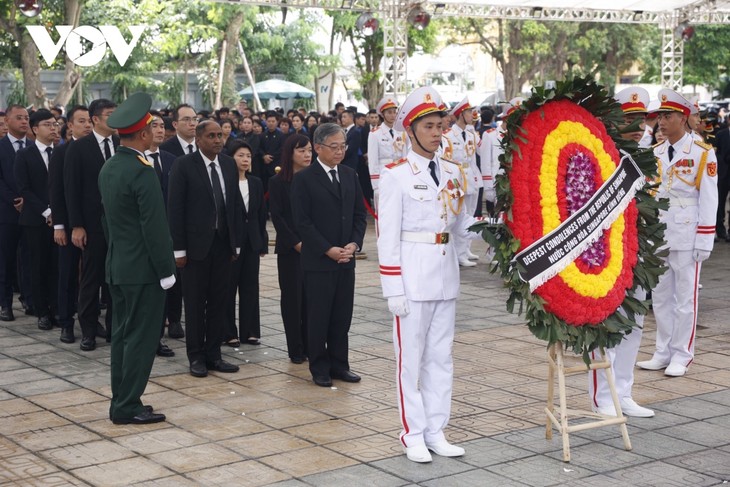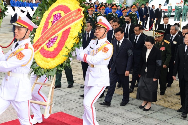 คณะผู้แทนลาวนำโดยเลขาธิการใหญ่พรรค ประธานประเทศลาว ทองลุน สีสุลิดเข้าเคารพศพเลขาธิการใหญ่พรรค เหงวียนฟู้จ่อง |