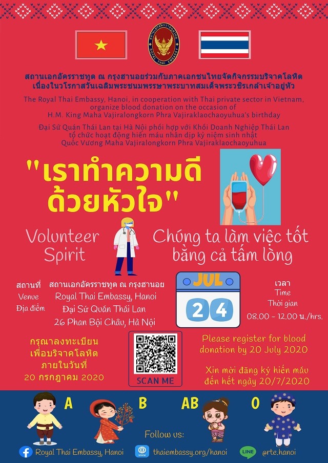 In honour of H.M. King Maha Vajiralongkorn Phra Vajiraklaochaoyuhua’s birthday anniversary, the Royal Thai Embassy, Hanoi, invites members of Thai and Vietnamese communities to make blood donation on 24 July 2020 during 08.00 - 12.00 hrs. at the Embassy.