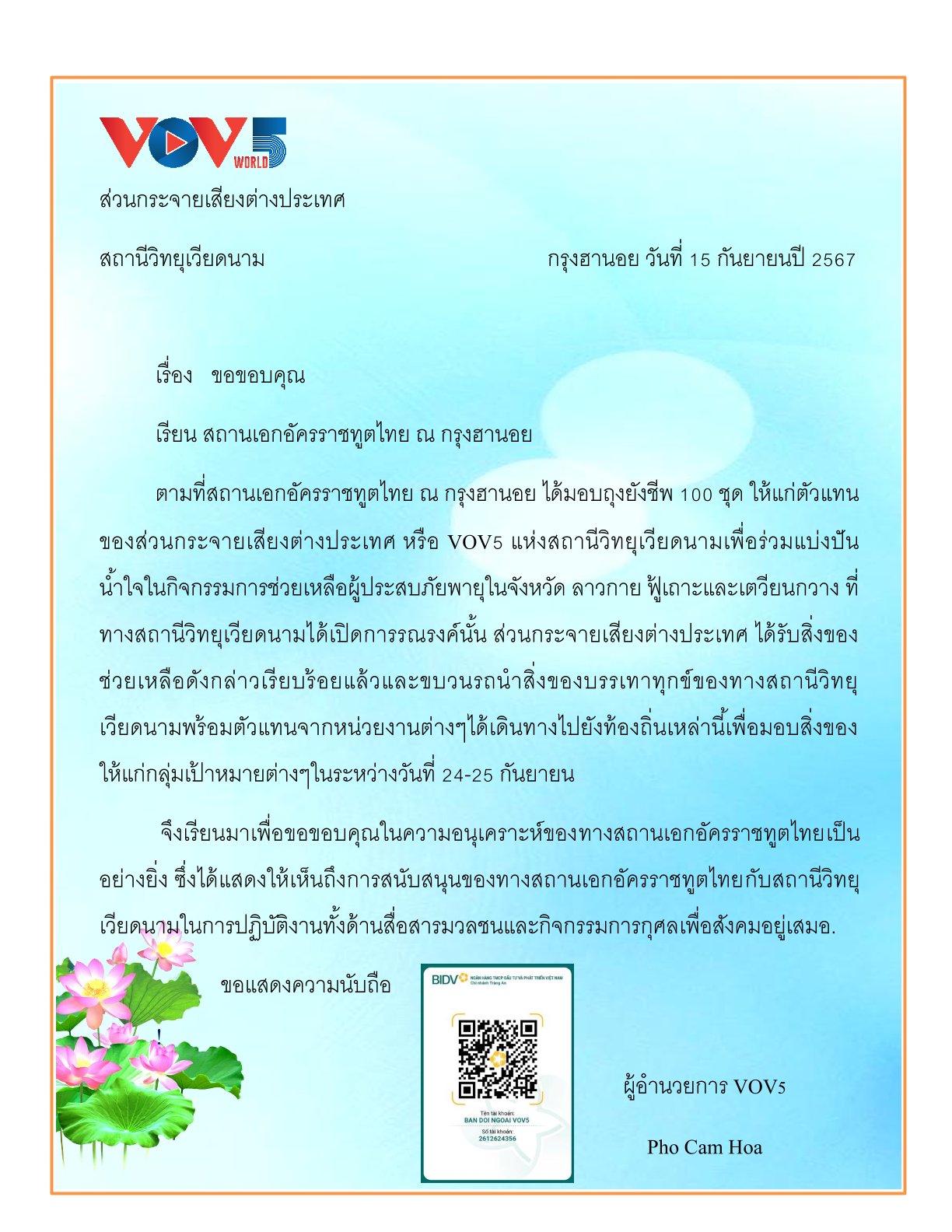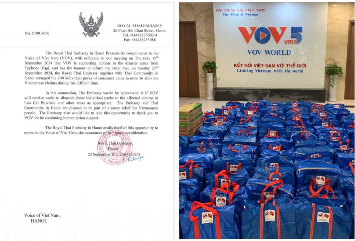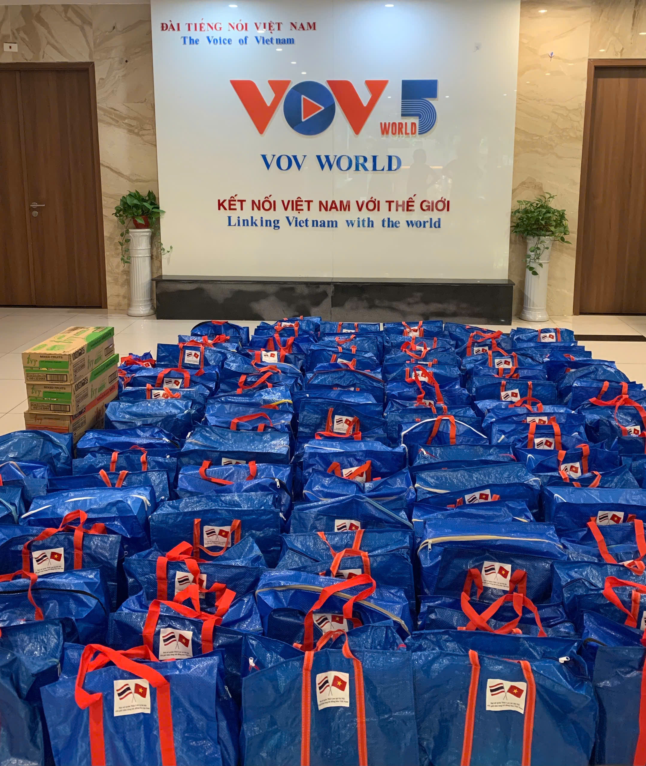ในนามส่วนกระจายเสียงต่างประเทศ นาย หว่างวันเฮื้อง รองเลขาธิการพรรคสาขาส่วนกระจายเสียงต่างประเทศ ได้กล่าวขอบคุณสถานเอกอัครราชทูตไทย ณ กรุงฮานอยที่ได้ขานรับคำเรียกร้องของวีโอวี 5 เกี่ยวกับการรับบริจาคเงินและสิ่งของช่วยเหลือประชาชนที่ได้รับผลกระทบจากพายุยางิในเวียดนาม เดินพร้อมกับวีโอวีในการปฏิบัติงานทั้งด้านสื่อสารมวลชนและกิจกรรมการกุศลอยู่เสมอและให้คำมั่นว่าจะส่งมอบสิ่งของบรรเทาทุกข์เหล่านี้ถึงกลุ่มเป้าหมายต่างๆ