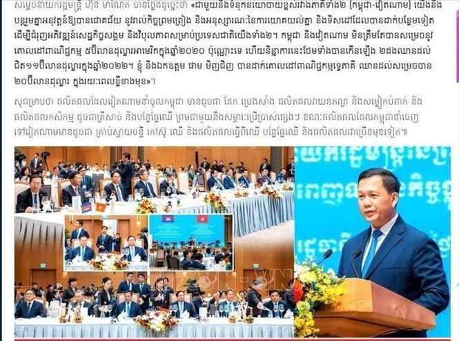 ส่วนสำนักข่าวแห่งชาติกัมพูชาได้อ้างคำกล่าวของนายกรัฐมนตรี ฮุน มาเนตว่า รัฐบาลทั้งสองประเทศได้กำหนดเป้าหมายการเพิ่มมูลค่าการค้าต่างตอบแทนขึ้นเป็น 5 พันล้านดอลลาร์สหรัฐในปี 2020 และเพิ่มขึ้นเป็นสองเท่าในปี 2022 อีกทั้งยืนยันว่า รัฐบาลทั้งสองประเทศตั้งเป้าไว้ว่า จะเพิ่มมูลค่าการค้าต่างตอบแทนขึ้นเป็น 2 หมื่นล้านดอลลาร์สหรัฐในเวลาที่จะถึง จากความไว้วางใจทางการเมืองในระดับสูง ทั้งสองประเทศจะปฏิบัติข้อตกลง บันทึกช่วยจำ แนวทางการผลักดันการพัฒนาเศรษฐกิจสังคมและความเจริญรุ่งเรืองของทั้งสองประเทศ นายกรัฐมนตรี ฮุน มาเนต กล่าวถึงการช่วยเหลือกันระหว่างสองประเทศในภารกิจการช่วงชิงเอกราชในอดีต พร้อมทั้งยืนยันว่า การที่กัมพูชาช่วยเหลือเวียดนามในการรวมประเทศเป็นเอกภาพและการที่เวียดนามช่วยกัมพูชาปลดปล่อยประเทศหลุดพ้นจากระบอบฆ่าล้างเผ่าพันธุ์เป็นความจริงที่ไม่มีฝ่ายใดสามารถบิดเบือนได้.