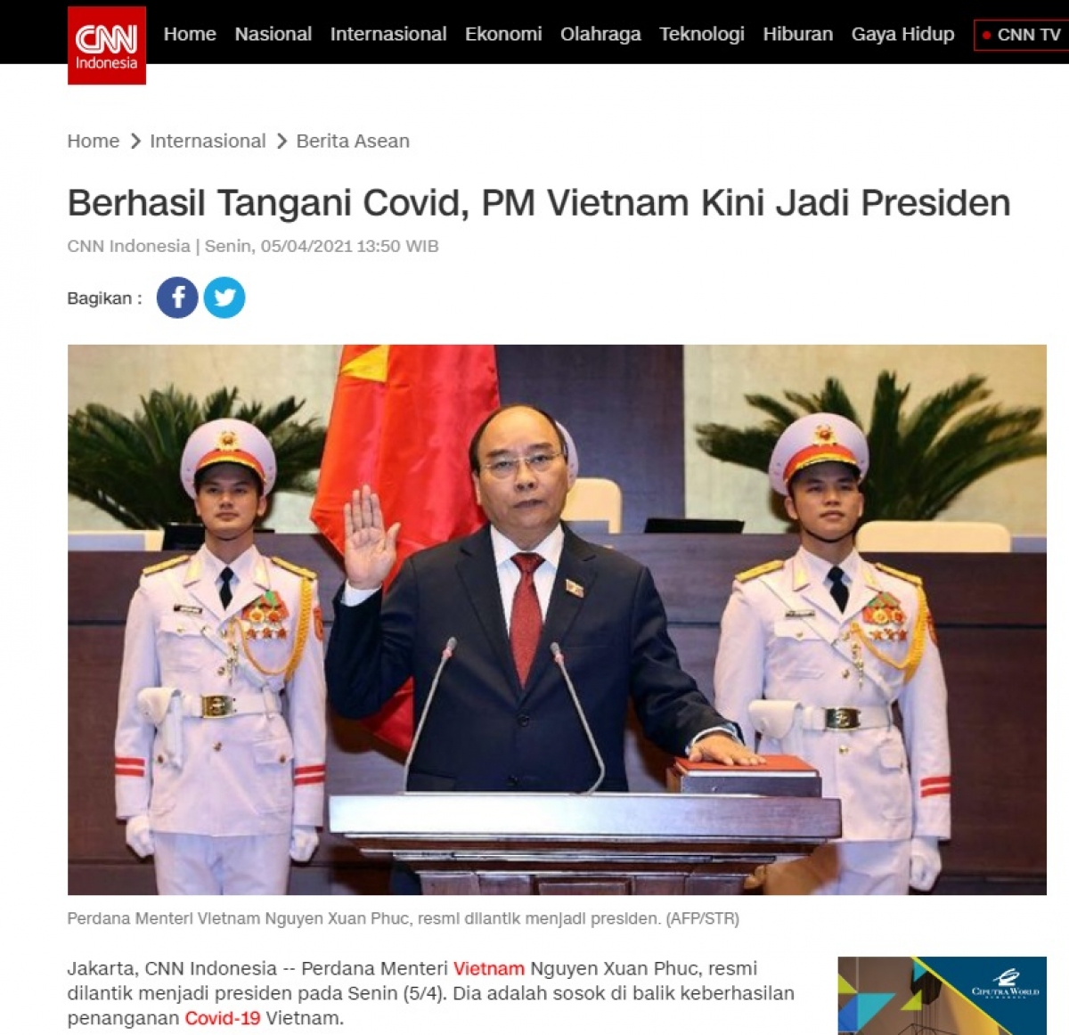 เว็บไซต์ CNN Indonesia ได้รายงานข่าวพิธีสาบานตนรับตำแหน่งของประธานประเทศเหงวียนซวนฟุก |