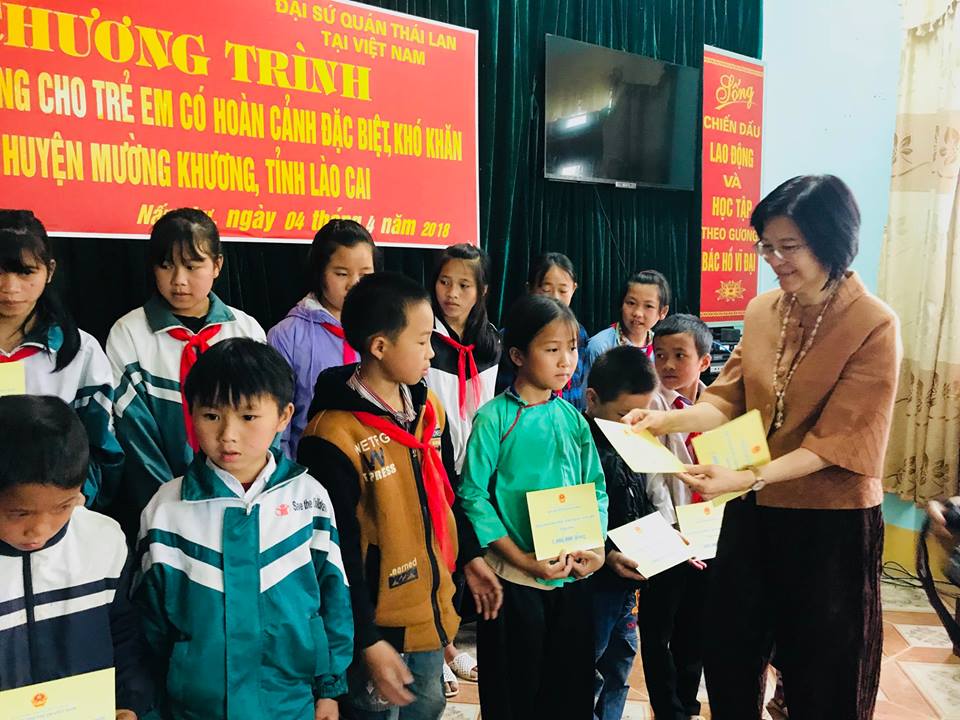ซึ่งชุมชนไทยในเวียดนามได้ร่วมกันบริจาคมอบให้แก่เด็กนักเรียนประถมศึกษาและมัธยมศึกษาจำนวน 100 คน ในอำเภอเหมื่องเคืองและอำเภอบ๋าวเอียน จ. ลาวกาย ในการนี้ น.ส.วันทนีย์ วิพุธวงศ์สกุล ได้กล่าวถึงความยินดีในการเป็นผู้แทนของภาครัฐและเอกชนไทยร่วมกิจกรรมการกุศลมอบของขวัญทุนการศึกษาให้แก่เด็กในโอกาสปีใหม่ของไทยหรือเทศกาลสงกรานต์ที่จะมาถึงในสัปดาห์หน้า และกล่าวถึงความสำคัญของเด็กซึ่งจะเป็นกำลังสำคัญและอนาคตของชาติ.