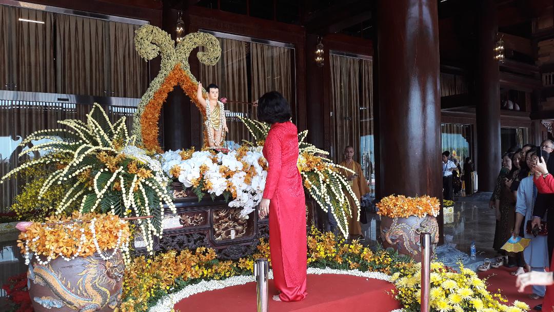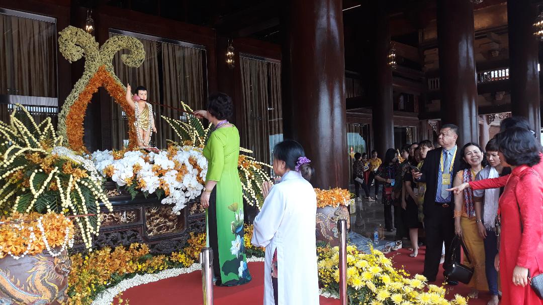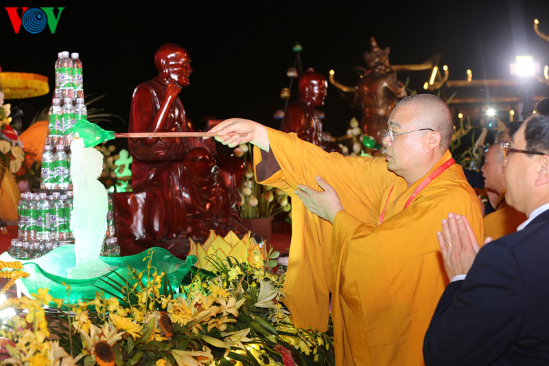 พระธรรมาจารย์ ทิกแทงเญียว รองประธานสภาบริหารพุทธสมาคมเวียดนามทำพิธีสรงน้ำพระ |