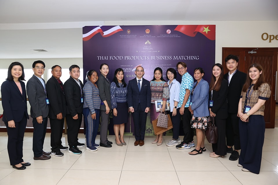 นายนิกรเดช พลางกูร เอกอัครราชทูตไทย ณ กรุงฮานอยและบรรดานักธุรกิจไทยที่เข้าร่วมการเชื่อมโยงด้านธุรกิจกับสถานประกอบการในจังหวัดกว๋างจิ (ภาพจากสถานเอกอัครราชทูตไทย ณ กรุงฮานอย) |