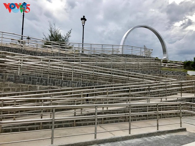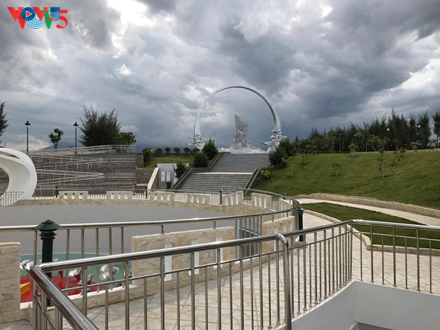 อนุสาวรีย์ทหารกากมาทำจากหินแกรนิตที่หนักกว่า 14 ตัน มีความสูง 15.15 เมตร เป็นงานแกะสลักหินทหาร 9 นายที่สะท้อนจิตใจยืนหยัดปกป้องอธิปไตยเหนือทะเลและหมู่เกาะอันศักดิ์สิทธิ์ของเวียดนาม |