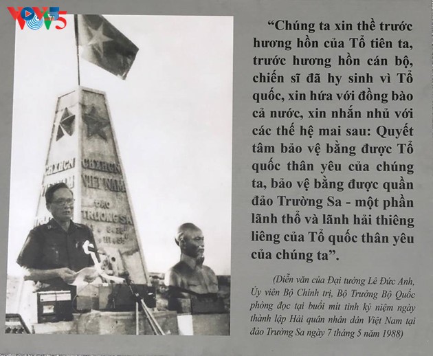 สุนทรพจน์ของพลเอกเลดึ๊กแอง สมาชิกกรมการเมืองพรรคและรัฐมนตรีว่าการกระทรวงกลาโหมเวียดนามที่กล่าวในพิธีรำลึกวันก่อตั้งกองทัพประชาชนเวียดนาม ณ เกาะเจื่องซาเมื่อวันที่ 7 พฤษภาคมปี 1988 |