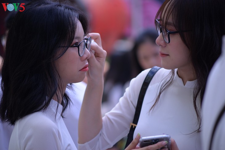 | ทุกคนในชุดนักเรียนและชุดอ๊าวหย่ายสีขาวมาถึงโรงเรียนตั้งแต่เช้า |