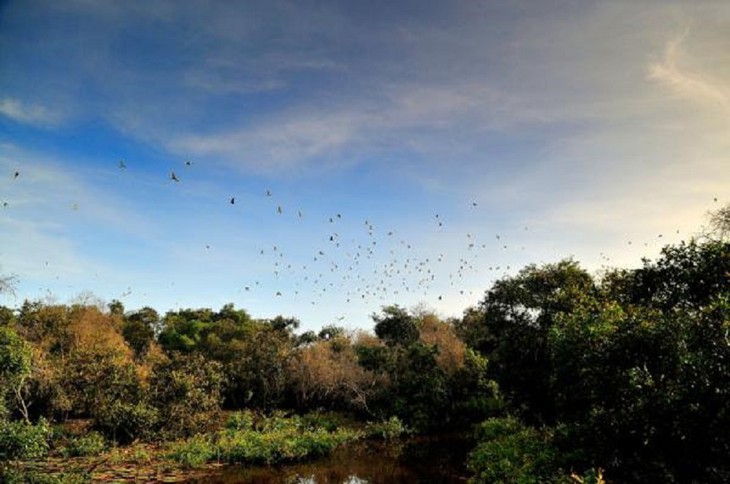ยามอาทิตย์อัสดง นักท่องเที่ยวจะได้ชมฝูงนกกระสาหลายพันตัวรวมกันที่ริมป่า (Diêm Đăng Dũng) |
