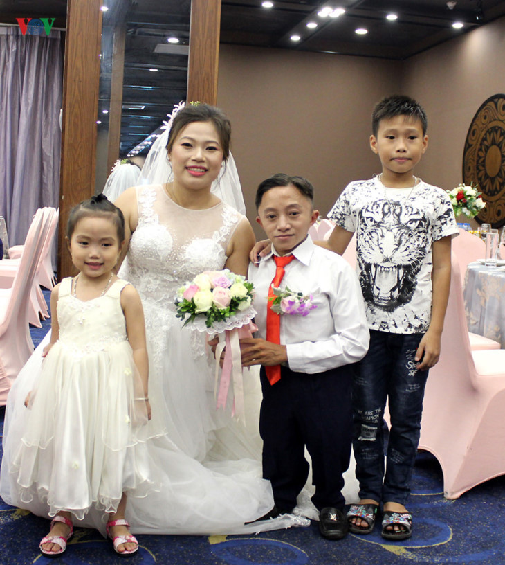 นาย กวี๊และ นาง เลวี๊ยน มีความสุขมาก เพราะนี่คือครั้งแรกในตลอด 14 ปีที่อยู่กินกันที่ได้มีโอกาสใส่ชุดแต่งงาน โดยลูกชายทั้ง 2 คนก็เข้าร่วมงานด้วย นาง เลวี๊ยน เผยว่า “ปัจจุบัน นาย หว่าง เท้ จ่อง ลูกชายคนโตคือดวงตาของพ่อแม่ ให้การช่วยเหลือพ่อแม่ทำงานบ้าน และมีหน้าที่หลักคือดูแลน้องชาย” |