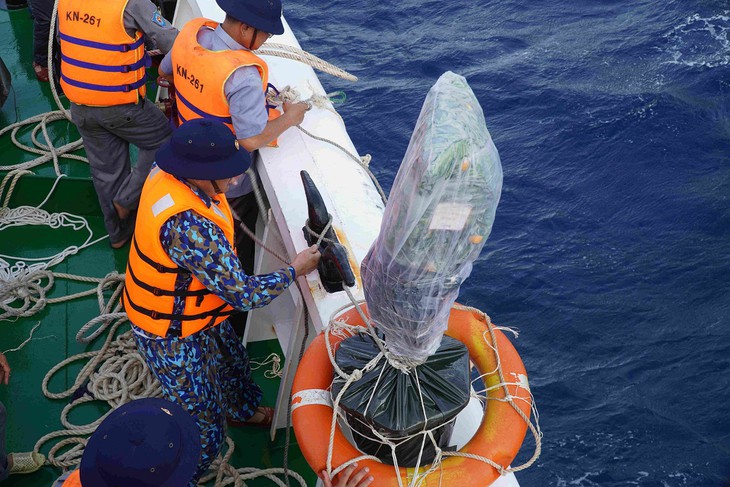 | เรือ KN 261 ปฏิบัติภารกิจพาคณะเจ้าหน้าที่ไปเยี่ยมเยือน ให้กำลังใจและมอบของขวัญให้แก่เจ้าหน้าที่ทหารที่แท่นตรวจการทางทะเลในแนวปะการัง ฟุกเติ่น บาแก่ เกว๊เดื่อง เหวี่ยนเจินและเรือตรวจการณ์ทางทะเล ๒ ลำ (ภาพ: ทหารลำเลียงต้นส้มจี๊ดซึ่งเป็นของขวัญของเยาวชนอำเภอวันยาง จังหวัดฮึงเอียนที่มอบให้แก่ทหารที่แท่นตรวจการทางทะเล) |