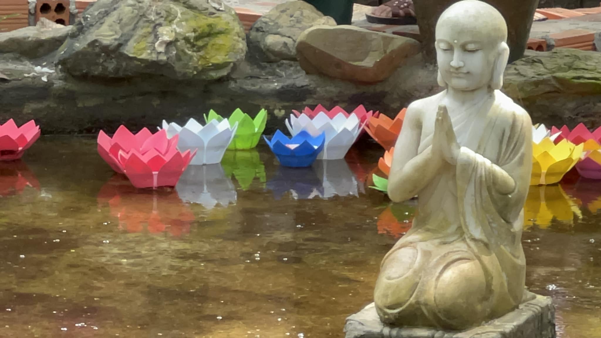 | หลังพิธีสวดมนต์ พระมหาเถระ ทิ๊กบิ๋วแช้ง พร้อมตัวแทนสมาคมมิตภราพลาว กัมพูชาและไทยลอยกระทงในสระดอกบัว |