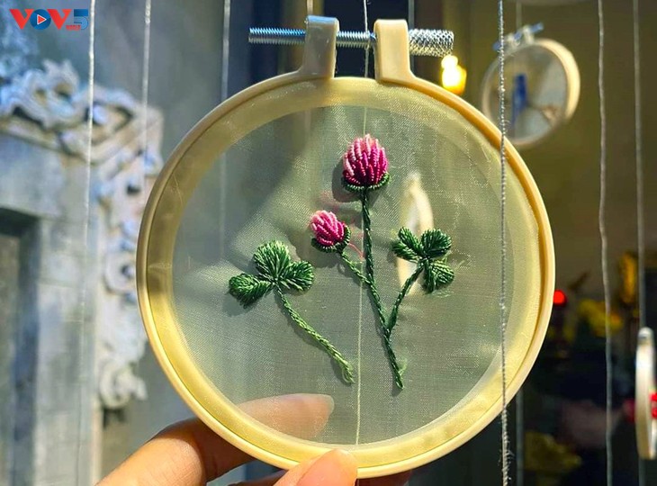 ที่วิหารดิ่งตู๊ มีการจัดแสดงภาพผ้าไหมเย็บปักถักร้อยโดยฝีมือของช่างศิลป์จากหมูบ้านเย็บปักถักร้อยก๊วดด๊ง |