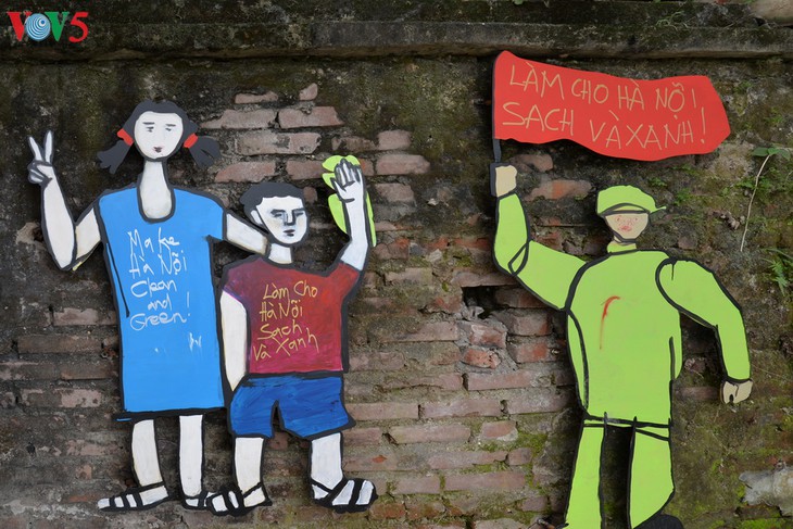 | ผลงานของศิลปิน เวืองวันถ่าว ที่ใช้เศษจานแตกมาทำเป็นรูปศาลาประจำหมู่บ้าน ซุ้มประตูหมู่บ้านในถนนโบราณ 36 สายของกรุงฮานอยเพื่อส่งสาส์นให้ร่วมกันอนุรักษ์และให้ความเคารพซุ้มประตูหมู่บ้านในตัวเมือง” |