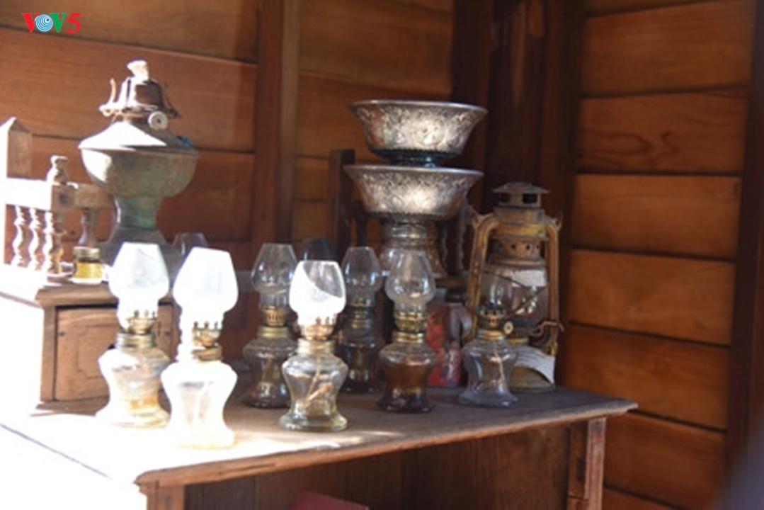 ตู้ไม้ตั้งตะเกียงน้ำมันเก่าๆในบ้านจำลองที่ท่านประธานโฮจิมินห์เคยอาศัยช่วงที่อยู่ในบ้านดง |