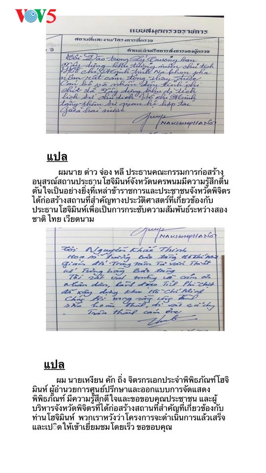 ไม่ว่าจะเป็นคนไทยหรือคนเวียดนามที่กำลังอาศัยในประเทศไทยต่างก็แสดงความรู้สึกซาบซึ้งเมื่อได้ทราบเกี่ยวกับสถานที่แห่งนี้และประทับใจกับน้ำใจของชาวไทยที่มีต่อประธานโฮจิมินห์