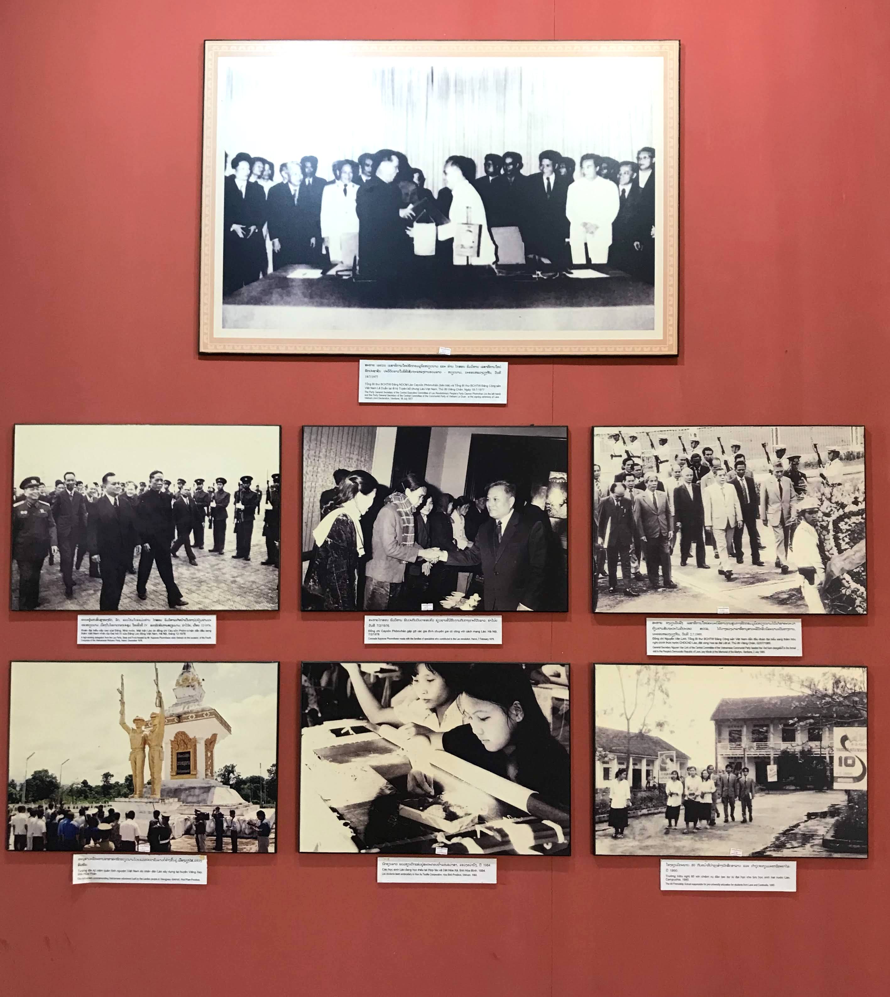 ทางเข้าชั้น 2 ของอนุสรณ์สถานฯ มีธงชาติเวียดนาม ธงชาติลาวและภาพถ่ายประธานโฮจิมินห์ให้การต้อนรับประธานไกสอน พมวิหานและกลองมโหระทึกของเวียดนาม |