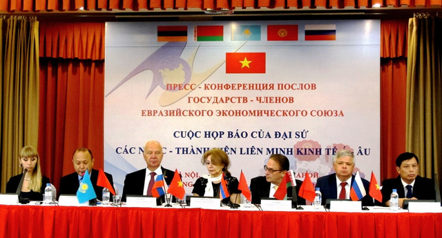 ![]() ภาพการแถลงข่าวร่วมของเอกอัครราชทูตบรรดาประเทศสมาชิกของสหภาพเศรษฐกิจเอเชีย – ยุโรป ณ กรุงฮานอยเมื่อเช้าวันที่ 5 ตุลาคม (Photo: quanhta.com.vn)
