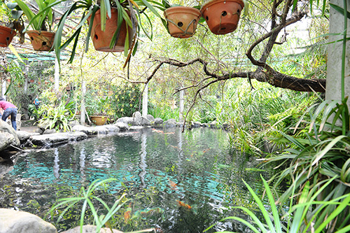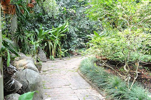 | บรรยากาศภายในบริเวณสวนบ้านเต็มไปด้วยสีเขียวของต้นไม้ |