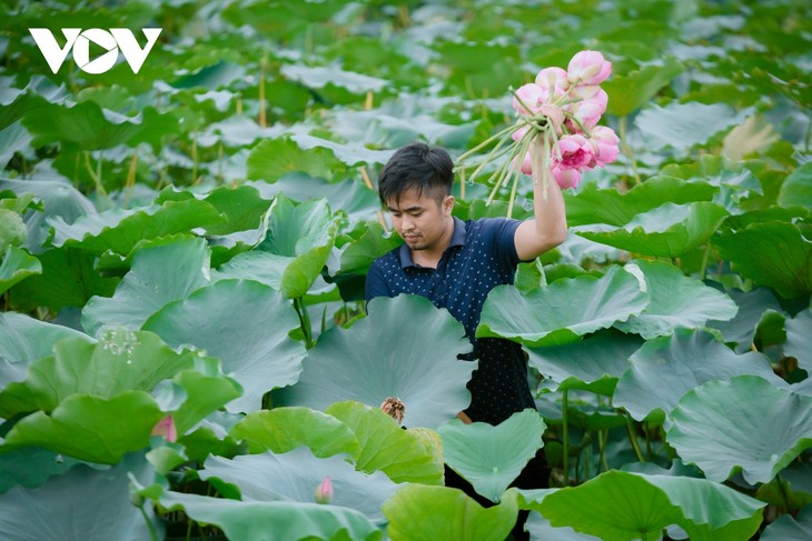 ในช่วงเดือนมิถุนายนของทุกปีเมื่อดอกบัวสีชมพูเริ่มบานสะพรั่ง คนงานในบริษัทของคุณเหยวียดต่างพายเรือไปตัดบัวตตั้งแต่เวลา 5 โมงเช้า เพื่อเตรียมวัตถุดิบสำหรับฤดูชารอบใหม่ |