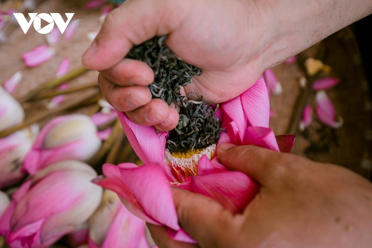 ส่วนชาดอกบัวแห้งต้องผ่านการอบหลายครั้ง โดยลงใบชาหนึ่งรอบก็ต้องใส่ส่วนปลายของเกสรดอกบัวหนึ่งรอบ แล้วนำไปผึ่งให้แห้ง แต่ละคนจะมีสูตรอบชาที่แตกต่างกัน |