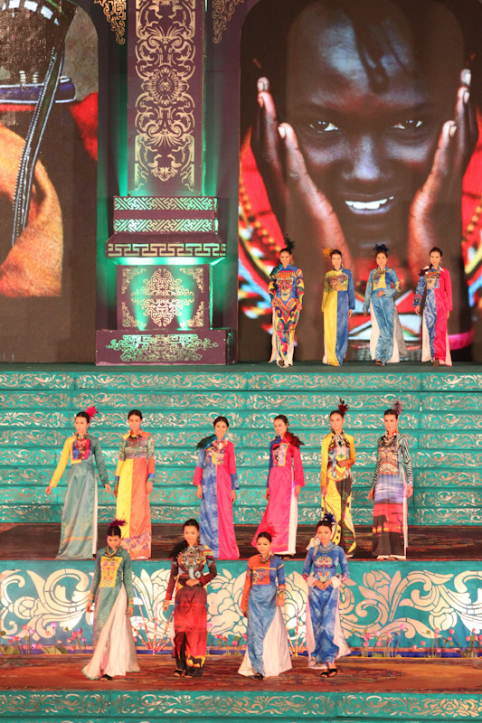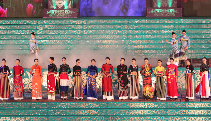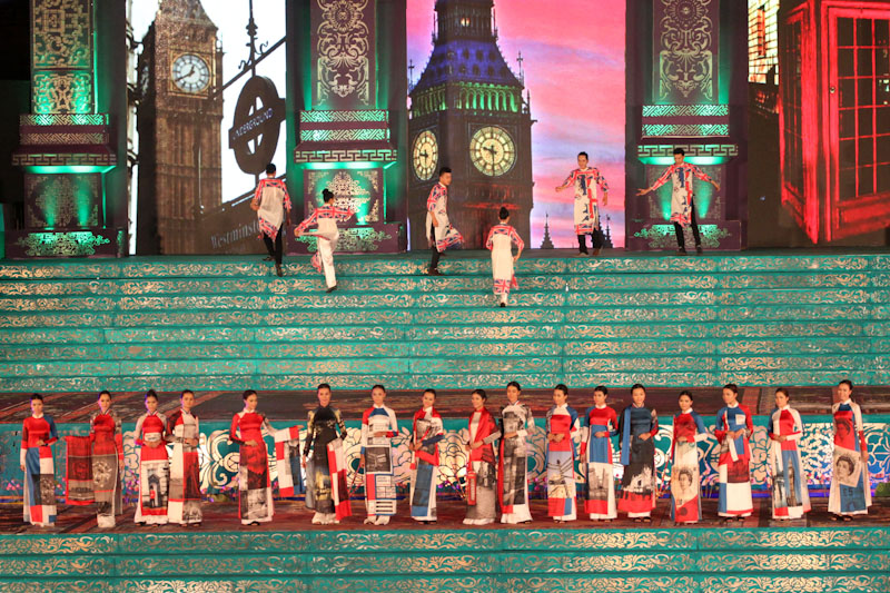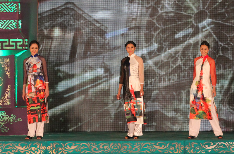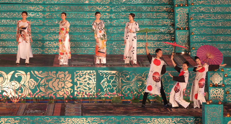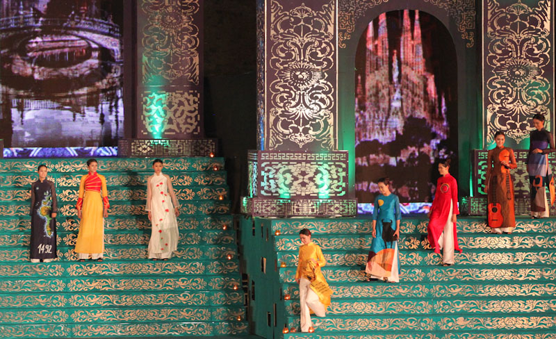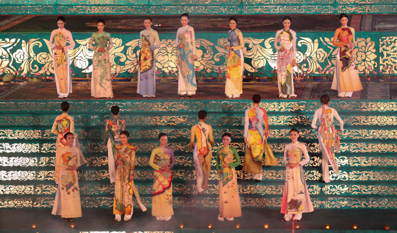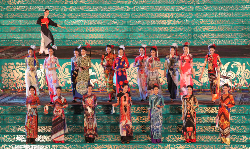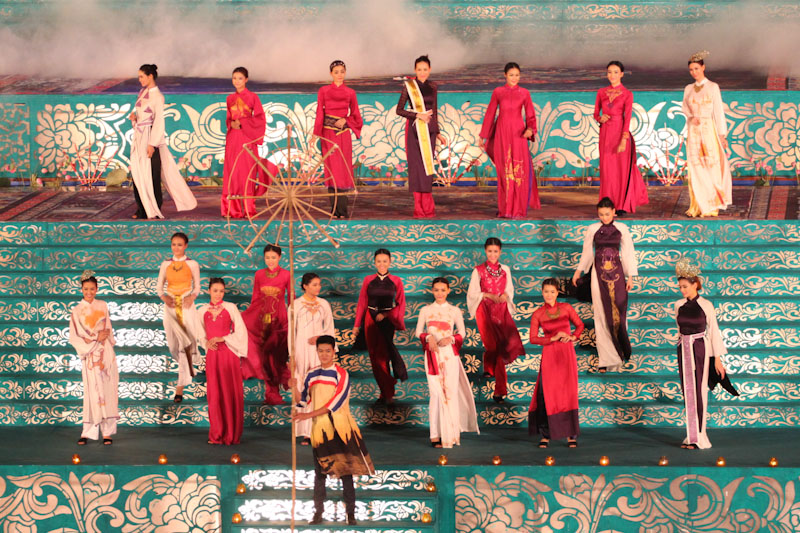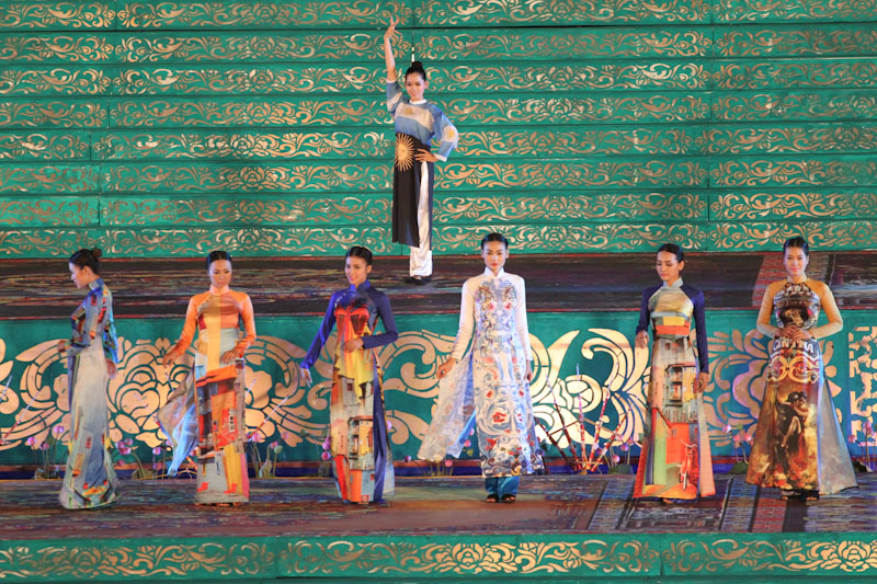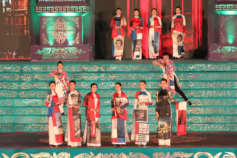 (VOVworld)-เทศกาล "โลกในชุดประจำชาติอ๊าวหย่ายเวียดนาม"เป็นหนึ่งในกิจกรรมหลักของงานเฟสติวัลเว้2014 เวทีเดินแฟชั่นมีความสวยงามอลังการ โดยออกแบบใช้โทนสีม่วงเป็นหลักและตกแต่งลวดลายศิลปะของพระราชวังเว้พร้อมศิลปะในการจัดแสดงพลุของศิลปิน Alain Hurbert ในงานได้มีการเดินแฟชั่นชุดประจำชาติ อ๊าวหย่ายของนักออกแบบ 18 คนจากทั้งสามภาคของเวียดนาม ซึ่งสะท้อนภาพลักษณ์และเอกลักษณ์ของ 18 ชาติทั่วโลกผ่านลวดลายต่างๆ และการเดินแบบได้มีขึ้นท่ามกลางเสียงดนตรีประกอบของประเทศนั้นๆ