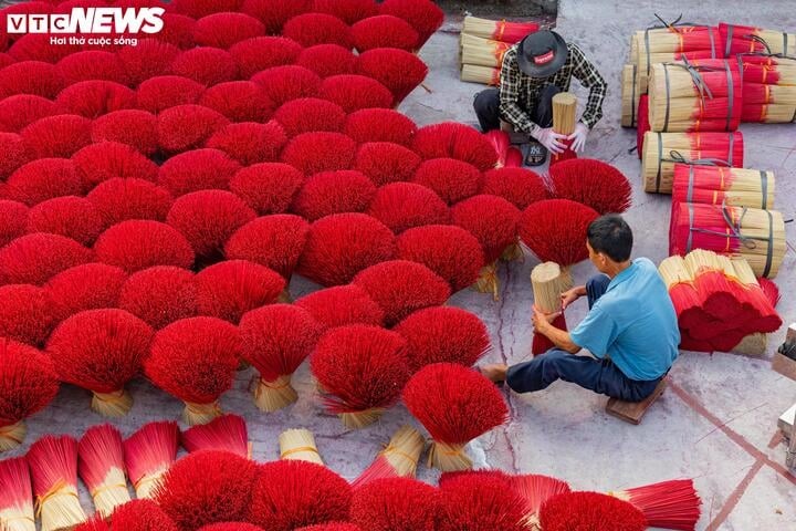 ก้านธูปหลังจากตากแห้งแล้วจะถูกมัดเป็นกำขนาดประมาณ 3 กิโลกรัม ดูคล้ายดอกไม้สีแดงช่อใหญ่ และจัดส่งไปยังโรงงานผลิตธูปทั่วประเทศ นอกจากจัดส่งไปยังโรงงานผลิตธูปในประเทศแล้ว ในหมู่บ้านกว๋างฟู้เกิ่วยังมีโรงงานผลิตธูปของตัวเองด้วย |