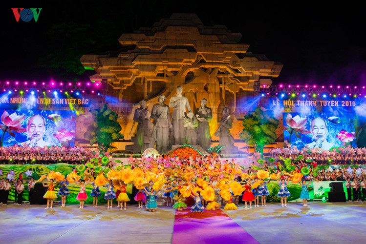![]() ในพิธีเปิด ได้มีการจัดรายการที่สดุดีความสวยงามของบ้านเกิดและคนในเขตเวียดบั๊ก ซึ่งมีบรรดาศิลปินเกือบ๗๐๐คนจาก๖จังหวัดได้แก่ห่ายาง เตวียนกวาง กาวบั่ง บั๊กก๋าน ท้ายเงวียนและหลางเซินเข้าร่วม