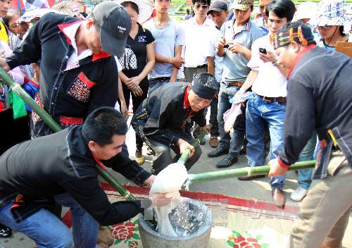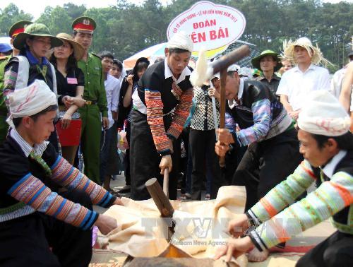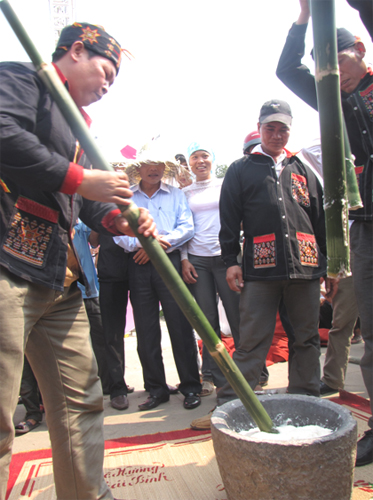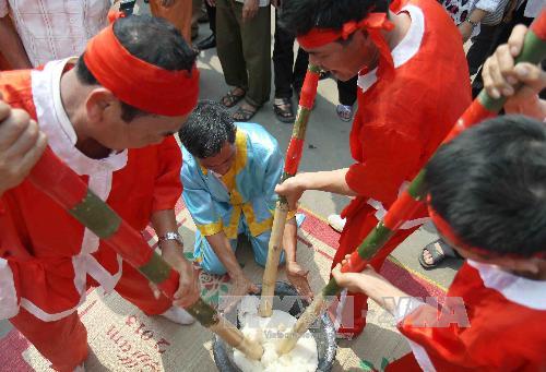 | ทุกคนร่วมกันตำข้าวเพื่อทำ banh giay (vietnamplus.vn) |