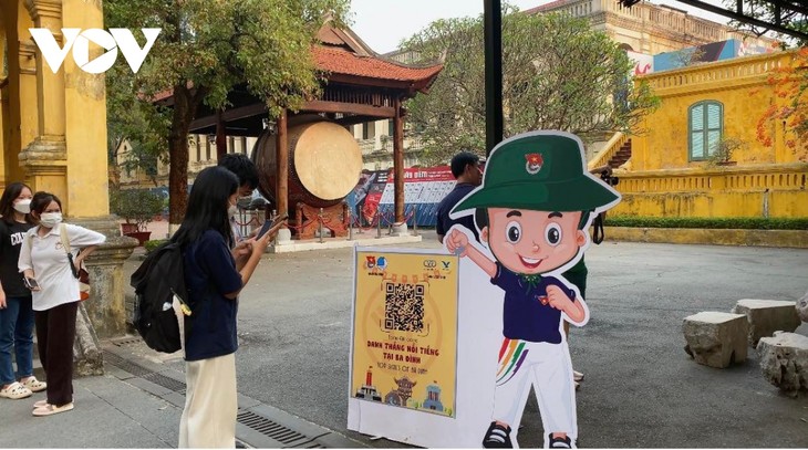 สมาชิกกองเยาวชนคอมมิวนิสต์โฮจิมินห์แนะนำทัวร์เสมือนจริงในโบราณสถานหว่างแถ่งทังลอง |