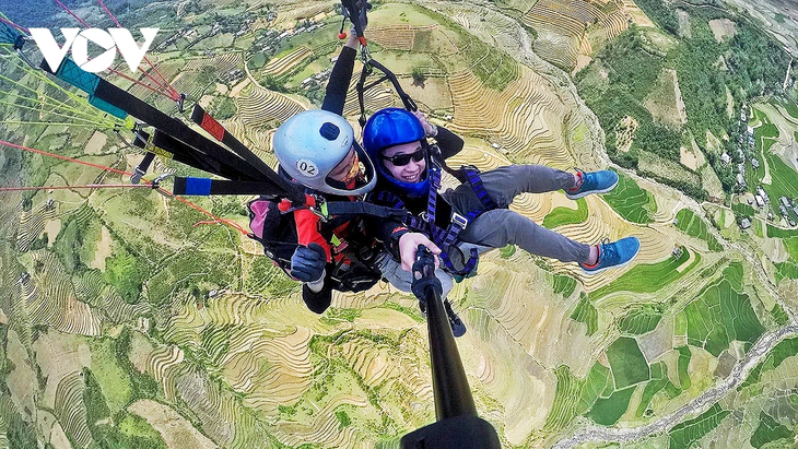 ในช่วงเวลาที่ผ่านมา นักท่องเที่ยวที่เดินทางไปยังช่องเขาเคาฝะ ในอำเภอหมู่กางฉาย ยังได้มีโอกาสสัมผัสและชมความงดงามตระการตาของทุ่งนาขั้นบันไดจากการเล่นร่มร่อน |