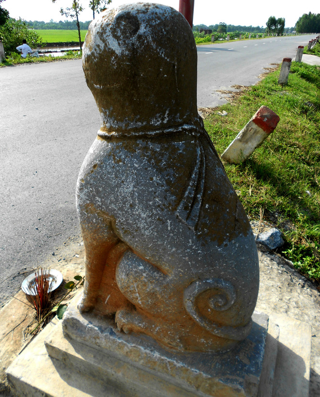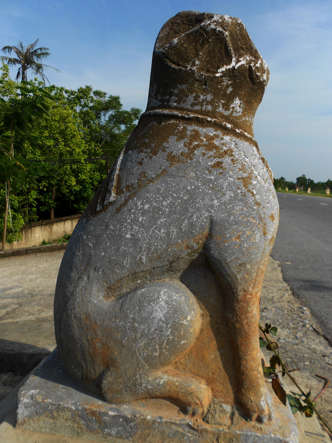 | สุนัขหิน 1 คู่ หนัก 300 กิโลกรัมในประตูของตำบลเวียนโหนย โดยมีเอกลักษ์การแกะสลักในยุคราชวงศ์เล |