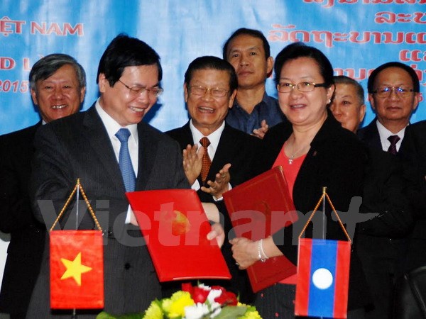นาย หวูฮุยหว่าง รัฐมนตรีว่าการกระทรวงอุตสาหกรรมและพาณิชย์เวียดนามและนางเข็มมะนี พนเสนา รัฐมนตรีว่าการกระทรวงอุตสาหกรรมและพาณิชย์ลาวลงนามข้อตกลงการค้าทวิภาคี(Photo: vietnamplus.vn) |