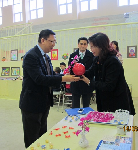 | นาง Pham Kim Nga รองครูใหญ่โรงเรียนมอบของขวีญให้แก่ ท่าน อนุสนธิ์ ชินวรรโณ |