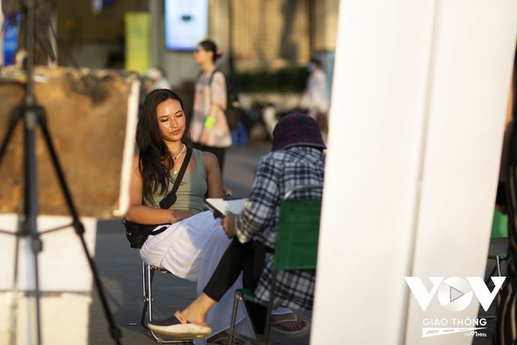 นักท่องเที่ยวต่างชาติเดินชมนิทรรศการภาพถ่ายที่จัดขึ้นกลางแจ้งในย่ายถนนคนเดินริมทะเลสาบหว่านเกี๊ยม |